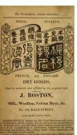 Philadelphia advertisement for J. Boston, dry goods, French, India, Italian, and English goods, dyeing, mourning work, Race Street 1822