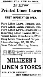 advertisement for Milliken’s Linen Stores, linen lawn, 828 Arch Street and 1128 Chestnut Street, Philadelphia, 1877, mourning