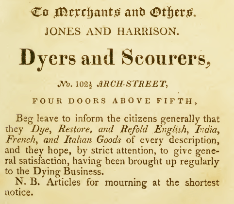 Philadelphia Index and Directory, 1823 Philadelphia advertisement for Jones and Harrison, dyers and scourers, Arch Street 1823 Like Loading...
