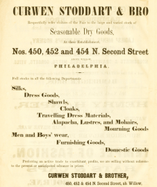 Philadelphia advertisement for Curwen Stoddart and Bro, dry goods and mourning goods, North Second Street 1864