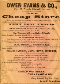 Philadelphia advertisement for Owen Evans and Co, The Cheap Store, dress goods and shawls, North Eighth Street 1864