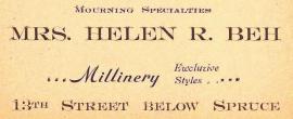 Philadelphia advertisement for Mrs. Helen R. Beh, millinery, mourning specialties, Thirteenth Street 1903