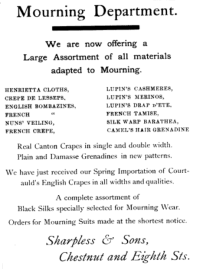 Philadelphia advertisement for Sharpless and Sons, Chestnut and 8th, mourning goods, dry goods crape black goods