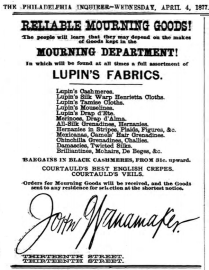 Inquirer, 4 April 1877 Philadelphia advertisement for John Wanamaker, 13th and Market, mourning goods, Lupin’s, crepes, fabrics Like Loading...