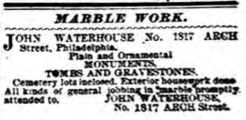 advertisement for John Waterhouse, 1817 Arch Street, Philadelphia, Inquirer, 1877, marble,gravestones, tombs, monuments, cemetery