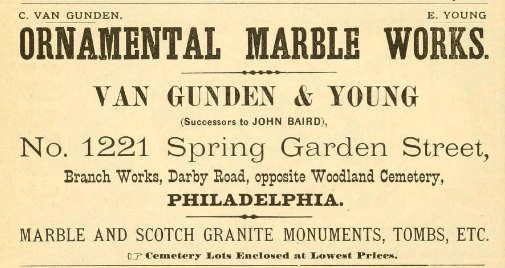 Philadelphia advertisement for Van Gunden and Young, ornamental marble works, 221 Spring Garden and opposite Woodlands Cemetery, 1876 tombs, monuments, cemetery enclosures