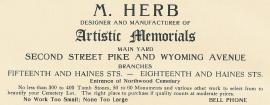 Philadelphia advertisement for M. Herb, artistic memorials, Second, Pike and Wyoming Streets or Haines at Fifteenth or Eighteenth 1912 Northwood Cemetery