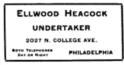 advertisement for Ellwood Heacock, undertaker, 2027 North College Avenue, Philadelphia, Friends’ Intelligencer, 1910, Quakers, Society of Friends