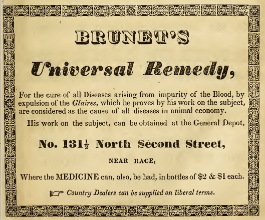 A. M’Elroy’s Philadelphia Directory, for 1839 Philadelphia advertisement for Brunet’s Universal Remedy, North Second Street 1839 Like Loading...