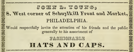 McElroy’s Philadelphia Directory for 1849 Philadelphia advertisement for John L. Young, hats and caps, Schuylkill Front and Market 1849 Like Loading...
