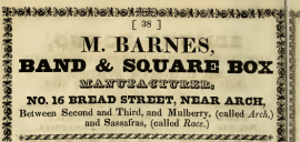 A. M’Elroy’s Philadelphia Directory, for 1840 Philadelphia advertisement for M. Barnes, boxes, Bread Street 1840 Like Loading...