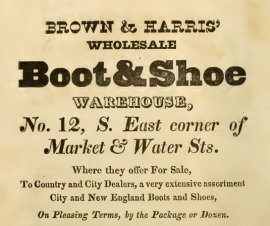 DeSilver’s Philadelphia Directory, and Strangers’ Guide. 1831 Philadelphia advertisement for Brown and Harris, boots and shoes, Market and Water 1831 Like Loading...
