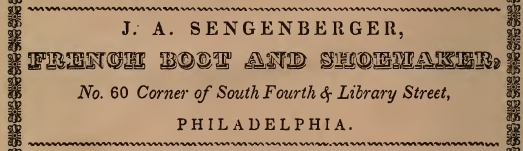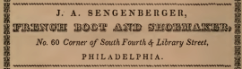 McElroy’s Philadelphia Directory for 1844 Philadelphia advertisement for J. A. Sengenberger, French boots, Fourth and Library 1844 Like Loading...