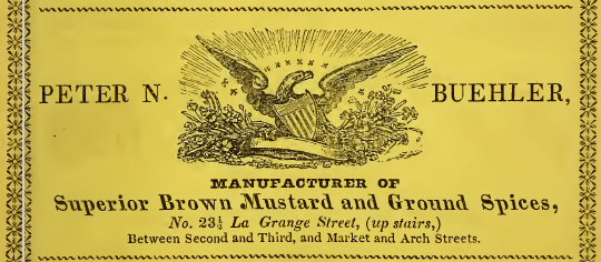McElroy’s Philadelphia Directory for 1845 Philadelphia advertisement for Peter N. Buehler, mustard and spices, La Grange Street 1845 Like Loading...
