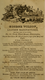 Robert DeSilver, The Philadelphia Index, or Directory, for 1823 Philadelphia advertisement for George Wilson, leather, North Third Street 1823 Like Loading...