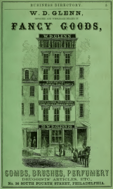McElroy’s Philadelphia City Directory, for 1858 Philadelphia advertisement for W. D. Glenn, fancy goods, South Fourth Street 1858 Like Loading...