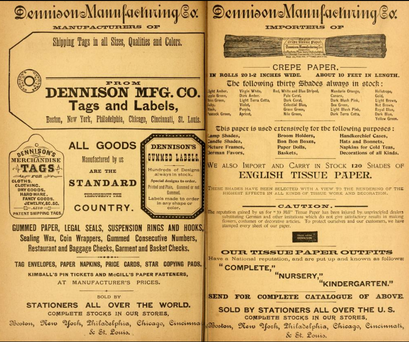 Philadelphia advertisement for Dennison Mfg. Co, 630 Chestnut, 1895, tags, labels, crepe paper, tissue paper, stationery, sealing wax, crafts