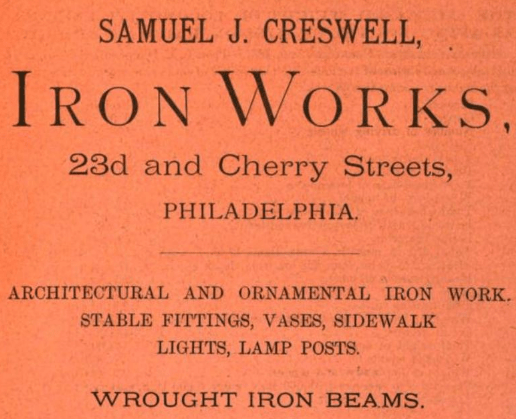 advertisement for Samuel J. Creswell, iron works, 23rd Street and Cherry Street, Philadelphia, Engineers’ Club, 1886, architectural iron work, stable fittings, sidewalk lights, vault lights, daylighting,, lamp posts, vases