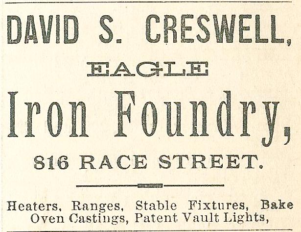 advertisement for David S. Creswell, Eagle Iron Foundry, 816 Race Street, Philadelphia, Boyd’s Directory, 1890, vault lights, stable fixtures, daylighting, ranges, heaters