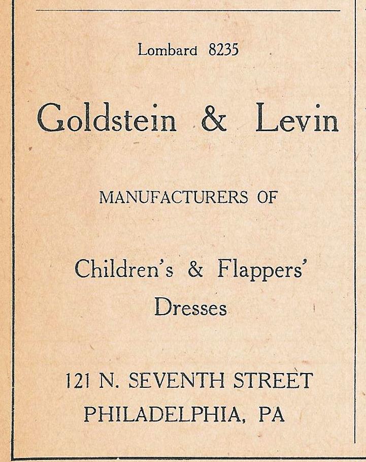 Philadelphia advertisement for Goldstein and Levin, dresses for children and flappers, North Seventh Street 1925 1920s fashion