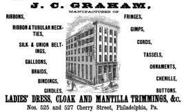 Philadelphia advertisement for J. C. Graham, dress, cloak, and mantilla trimming buttons notions, Cherry Street 1866