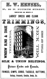 Philadelphia advertisement for H. W. Hensel, ladies’ dress and cloak trimmings and notions, North Fourth Street 1867