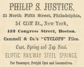 Philadelphia advertisement for Philip S. Justice, Cyclops files,steel springs for railroads, North Fifth Street 1860