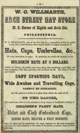Philadelphia advertisement for W. C. Willmarth, hats, Eighth and Arch 1855 wide awakes moleskin Civil War