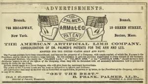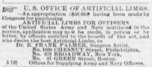 As the war went on, this company engaged in its distinctive brand of flag-waving while its operations became increasingly entwined with those of the government. In the 1862 advertisement (incomplete in its scanned version) it was noted that “[t]he ARMY and NAVY SURGEONS have adopted the PALMER LIMBS.” By 1865, discharged soldiers who needed the Palmer Leg, Palmer Arm, or Lincoln Arm were to forward their discharge papers to one of the company’s offices, whereupon they would “be furnished with all necessary to obtain an order for the Limb.” Sailors were to obtain instructions from a naval surgeon. The prices of the limbs were to be “the same as heretofore to officers and civilians.”