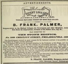 advertisement for B. Frank Palmer, artificial limbs,at the Stone Edifice, 1609 Chestnut, Philadelphia, 1862