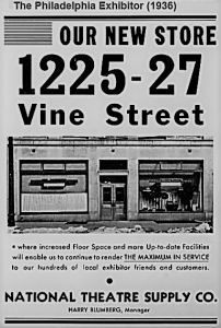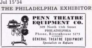 symbol on the map). This page focuses on 1934-36 to take advantage of the multitude of local advertisements published in Philadelphia Exhibitor. Of about a hundred Philadelphia businesses advertised during those years, more than half were in the area covered by the map above. (The linked symbols represent addresses where more than one business was present. One such address was on Race; the others were on Vine.) More than a dozen businesses were just outside the map, within four blocks, and the Film Folks (perhaps successors of Emanuel’s Reel Fellows) held celebrations nearby at the Broadwood Hotel (North Broad and Wood SW) and the Lulu Temple (Spring Garden east of North Broad).