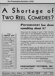 Philadelphia advertisement for Paramount Pictures, 1201 Vine Street, two-reel comedies, film exhibitors, Film Row, Earle W. Sweigert, PHILADELPHIA EXHIBITOR, 1936