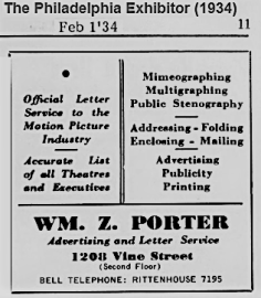 Philadelphia advertisement for William Z. Porter, advertising and letter service, 1208 Vine, theaters, Vine Street, Film Row, addressing, publicity, printing, PHILADELPHIA EXHIBITOR 1934