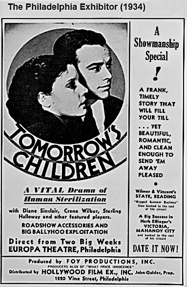 Philadelphia advertisement for Hollywood Film Exchange, 1220 Vine, TOMORROW’S CHILDREN, sterilization, Foy Productions, ballyhoo, Vine Street, Film Row, PHILADELPHIA EXHIBITOR 1934