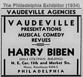 Philadelphia advertisement for Harry Biben, vaudeville, revues, agent, Colonial Building,1237 Market, Market and N. 13th NE, theaters, movies, Film Row, PHILADELPHIA EXHIBITOR 1934