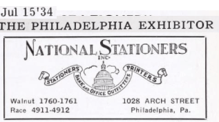 Philadelphia advertisement for National Stationers, 1028 Arch, theaters, Film Row, PHILADELPHIA EXHIBITOR 1934
