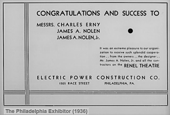 Philadelphia advertisement for Electric Power Construction Co., 1505 Race, Renel Theater, electricity, contractors, Film Row, PHILADELPHIA EXHIBITOR 1936