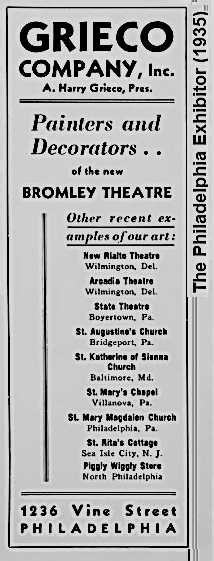 Philadelphia advertisement for Grieco Company, A. Harry Greico, painters, decorators, Bromley Theater, St. Mary Magdalen Church, Piggly Wiggly, Vine Street, Film Row, PHILADELPHIA EXHIBITOR 1935