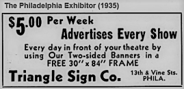 Philadelphia advertisement for Triangle Sign Co., 1242 Vine or Vine and North 13th, theaters, banners, publicity, Vine Street, Film Row, PHILADELPHIA EXHIBITOR 1935