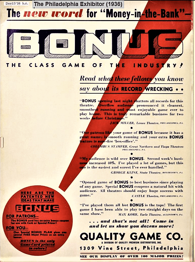 Philadelphia advertisement for Quality Game Co., 1309 Vine, Bonus game, theaters, promotions, Vine Street, Film Row, PHILADELPHIA EXHIBITOR 1936