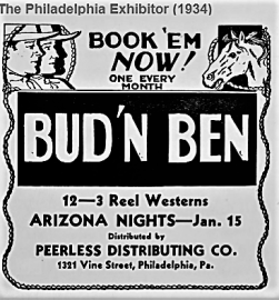 Philadelphia advertisement for Peerless Distributing Co., 1321 Vine, Bud ‘n Ben, western movie, film distributor, Vine Street, Film Row, PHILADELPHIA EXHIBITOR 1934