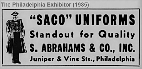 Philadelphia advertisement for S. Abrahams and Co., Saco uniforms, Vine and Juniper, theaters, ushers, Vine Street, Film Row, PHILADELPHIA EXHIBITOR 1935