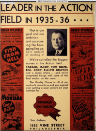 Philadelphia advertisement for Preferred Pictures, 1323 Vine, film distributor, Tarzan, McCoy, Tom Keene, Bill Cody, Ralph Graves, westerns, movies, Vine Street, Film Row, PHILADELPHIA EXHIBITOR 1935
