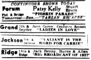 movie listings, Philadelphia theaters, December 1936, INQUIRER, Forum Theater, Grand Theater, Jackson Theater, Ridge Theater, PIGSKIN PARADE, LADIES IN LOVE, VALIANT IS THE WORD FOR CARRIE, BIG BROADCAST OF 1937