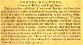 Philadelphia Directory and Register, 1793 Philadelphia advertisement for Bowen’s Wax-Work, Eighth and High or Market 1793 sideshow Like Loading...