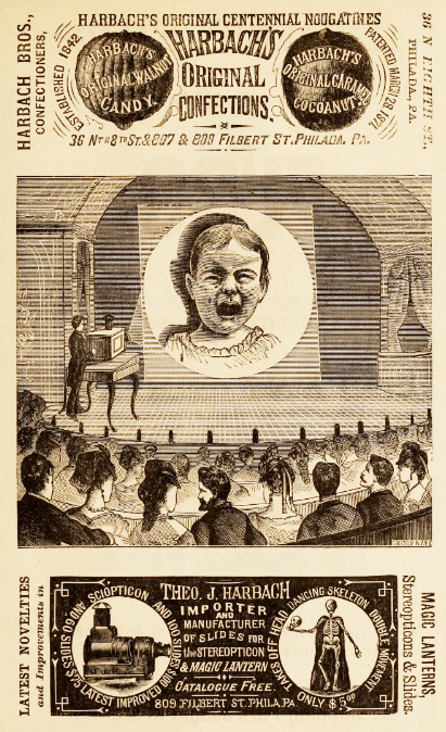 Philadelphia advertisement for Theo J. Harbach, stereopticons, magic lanterns, and confections, caramel cocoanut, dancing skeleton, crying baby, 807 and 809 Filbert 1876