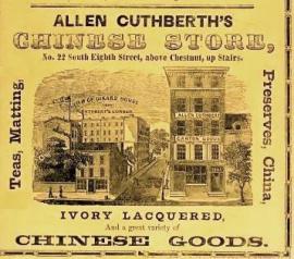 Philadelphia advertisement for Allen Cuthberth’s Chinese store, ivory lacquered, tea, preserves, matting, china, South Eighth Street 1854