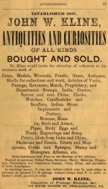 Philadelphia advertisement for John W. Kline, antiquities and advertisements, South Eighth Street 1874 Confederate stamps, fossils, minerals, Asian artifacts, idols, china