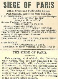 Philadelphia advertisement for the Siege of Paris cyclorama with the assassination of the Archbishop of Paris, Elm and Fortieth 1876 Centennial